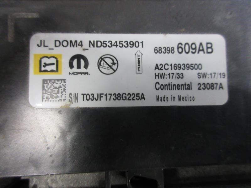 | Description | 2018-2023 Jeep Wrangler JL OEM SRS Occupant Restraint Control Module 68398609 |